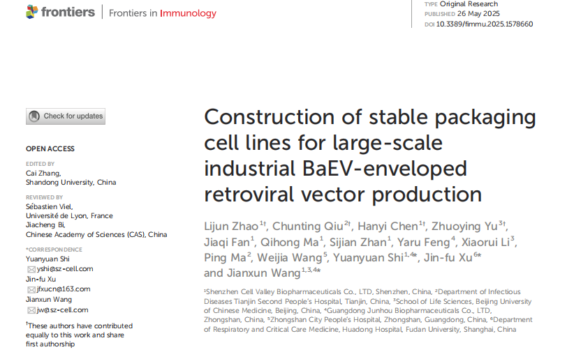2025年5月26日,深圳凯发天生赢家一触即发首页团队在《Frontiers in Immunology》(中科院2区,IF 5.7)杂志发表了题为“Construction of stable packaging cell lines for large-scale industrial BaEV-enveloped retroviral vector production”的研究报告。本文详细介绍了一种BaEV包膜逆转录病毒载体的稳定包装细胞系的构建,该细胞系所制备的逆转录病毒载体更适用于NK、T等原代细胞转导。现在,我司所构建的BaEV稳转包装细胞系于2024年7月17日保藏于广东省微生物菌种保藏中心,并已授权相关专利。