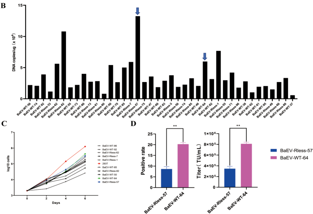 在此基础上,转染BaEV包膜质粒,顺利获得抗性筛选单克隆细胞,对得到的单克隆细胞进行瞬转产毒滴度测试,筛选产毒滴度高且生长状态不受影响的单克隆细胞,即为BaEV逆转录病毒载体的稳定包装细胞株(BaEV-PackRV)。