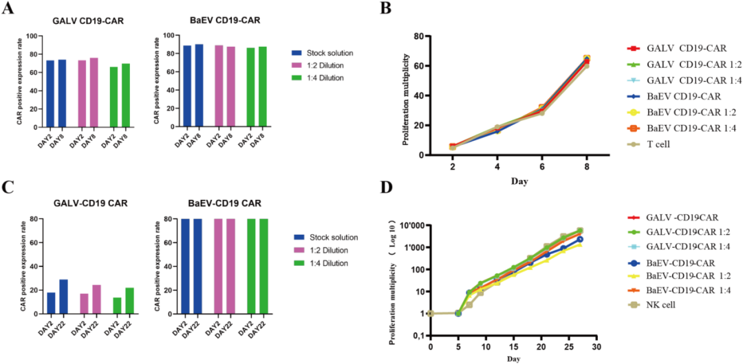 基于上述所得的BaEV逆转录病毒载体包装细胞系,我们构建了BaEV-CD19 CAR-RV与传统GaLV-CD19 CAR-RV,并使用其感染原代T与NK细胞。结果表明,相较于GaLV-CD19 CAR-RV,BaEV-CD19 CAR-RV在极低滴度和低MOI下仍具有良好的原代细胞转导效率。