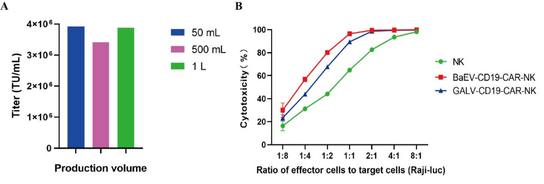 此外,本团队测试了大规模工业生产中产生的BaEV-CD19 CAR-RV的滴度。结果表明,BaEV-CD19 CAR-RV能够在50 mL、500 mL和1 L的生产体积中维持高滴度。这表明该系统能够保障BaEV包膜逆转录病毒载体的大规模工业生产。细胞毒性试验的结果显示,由BaEV-CD19 CAR-RV制备的CAR-NK细胞表现出比由GALV-CD19 CAR-RV制备的CAR-NK细胞更强的细胞毒性。
