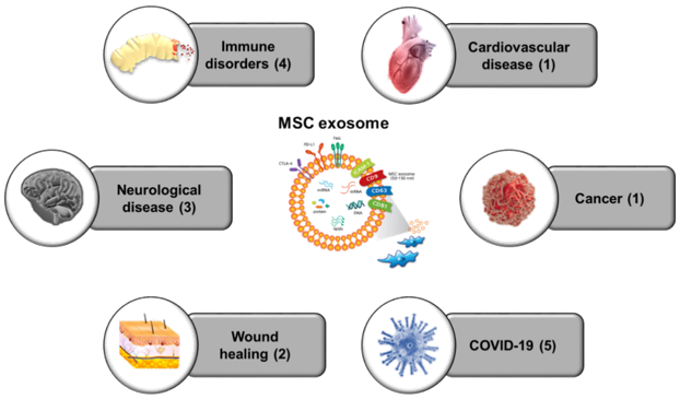 间充质干细胞源性外泌体(MSC-derived exosomes是MSCs旁分泌作用的主要物质,也是现在研究和应用最广泛的外泌体之一。其包含与MSCs类似治疗性的生长因子及mRNA等生物活性物质,具有组织修复、免疫调节等疗效,同时又具备独特的优势,如:无自我复制能力,所以没有致瘤性;纳米级体积避免毛细血管截留,可以顺利获得血脑屏障到达中枢神经系统损伤部位发挥生物学作用等。