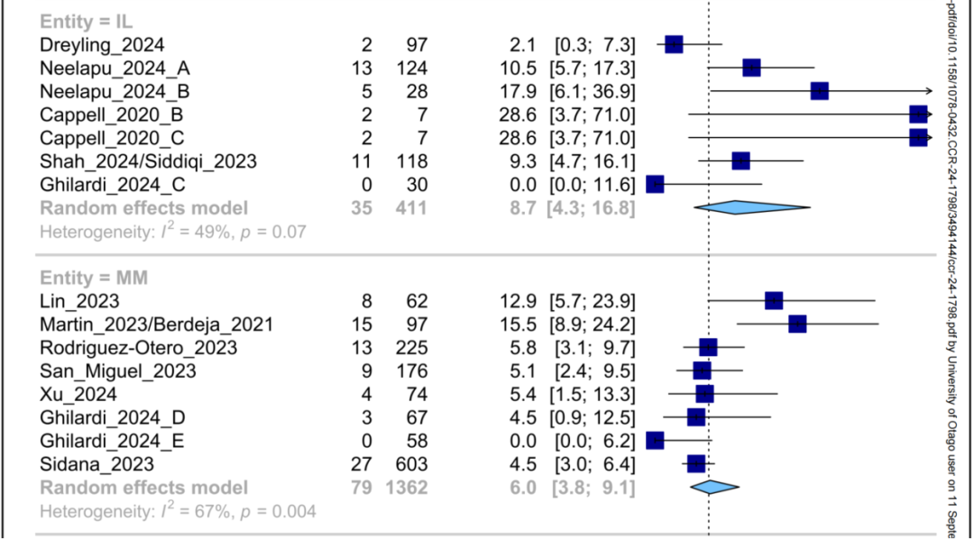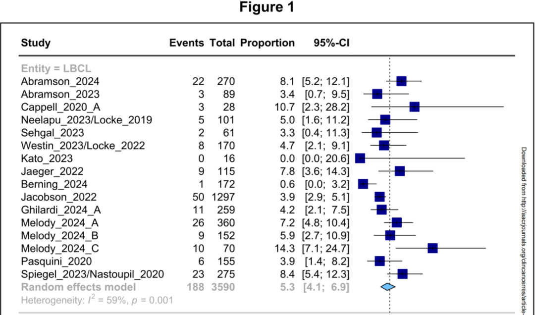 [2] Tobias Tix, Mohammad Alhomoud, Roni Shouval, Edward R. Scheffer Cliff, Miguel-Angel Perales, David M. Cordas dos Santos, Kai Rejeski; Second Primary Malignancies after CAR T-Cell Therapy: A Systematic Review and Meta-analysis of 5,517 Lymphoma and Myeloma Patients. Clin Cancer Res 15 October 2024; 30 (20): 4690–4700.