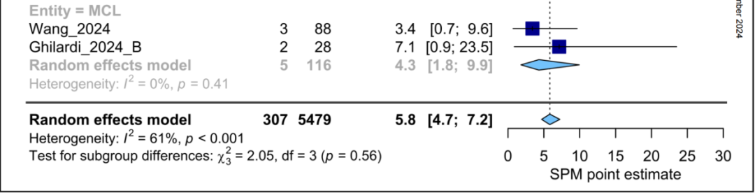 (1)研究人员从18项clinical trials (CT)和7项real- world studies(RWS)中确定了5517名患者的326种SPM。中位随访21.7个月,总体SPM点估计(point estimate)为6.0%(95% CI 4.7-7.2),如图1所示。