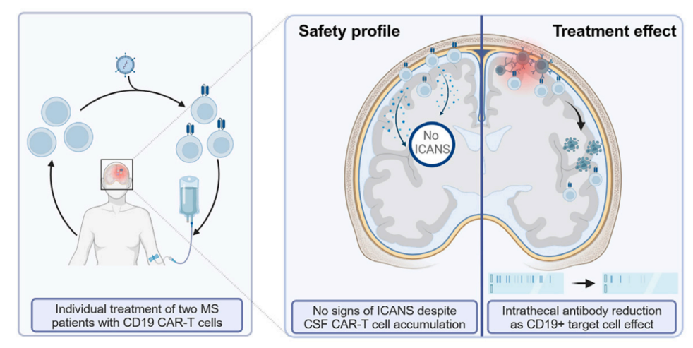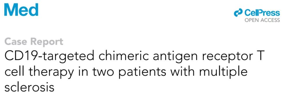[4]Fischbach F, Richter J, Pfeffer LK, Fehse B, Berger SC, Reinhardt S, Kuhle J, Badbaran A, Rathje K, Gagelmann N, Borie D, Seibel J, Ayuk F, Friese MA, Heesen C, Kröger N. CD19-targeted chimeric antigen receptor T cell therapy in two patients with multiple sclerosis. Med. 2024 Mar 22:S2666-6340(24)00114-4. doi: 10.1016/j.medj.2024.03.002. Epub ahead of print. PMID: 38554710.