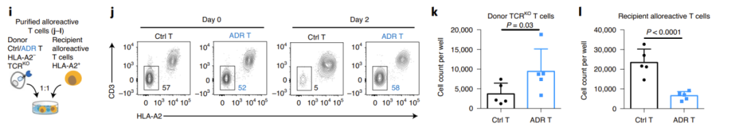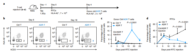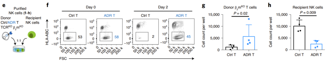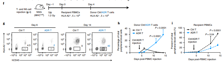 随后,研究者建立了异体免疫排斥的小鼠模型,第一时间使用半致死剂量的射线清除了小鼠淋巴细胞,然后回输受体T细胞或PBMC,并在4天后回输异基因型的供体细胞。在18天/14天时,对照组的供体细胞已被彻底清除,而ADR T细胞则显著扩增,且有效地抵抗了异源性T细胞和NK细胞的免疫排斥(图3)。