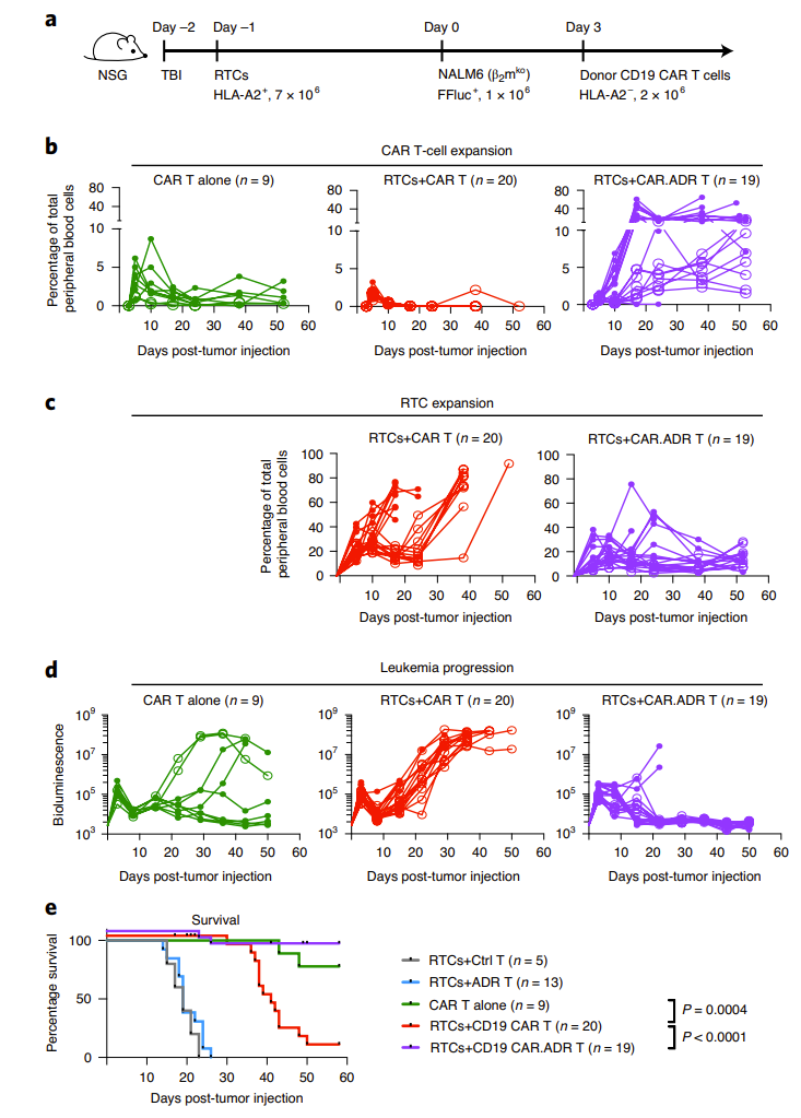 研究者还在动物免疫排斥模型的基础上建立了B细胞淋巴瘤模型。他们发现,在没有受体T细胞RTCs(即免疫排斥反应)存在的情况下,CD19 CAR T细胞在大多数小鼠中能够消除预先建立的肿瘤并持续较长时间。然而,在存在RTCs的情况下,CD19 CAR T细胞在95%动物模型中迅速被排斥,导致外周血中RTCs的扩增,CD19 CAR-T细胞治疗仅在短时间内发挥抗肿瘤效果,随后几乎所有小鼠的癌症迅速复发,且最终死亡。但在CAR ADR T细胞治疗中,RTCs处理的小鼠外周血中CAR T细胞得到显著的增殖,同时观察到RTCs表现出明显的抑制,这种治疗方法充分控制了淋巴癌的进展,小鼠的生存期相较其它组显著延长(图5)。