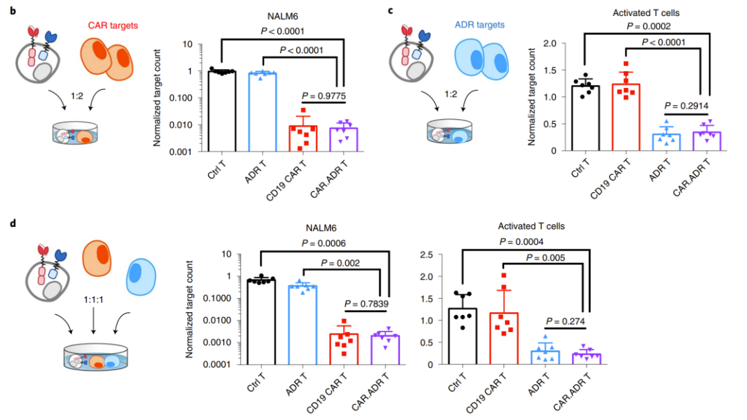 此外,研究者在体外实验证明,共表达ADR的CD19 CAR T(CAR ADR T)细胞与靶细胞NALM6以及激活的异体T细胞的共培养后,均保持了各自的活性功能(图4)。