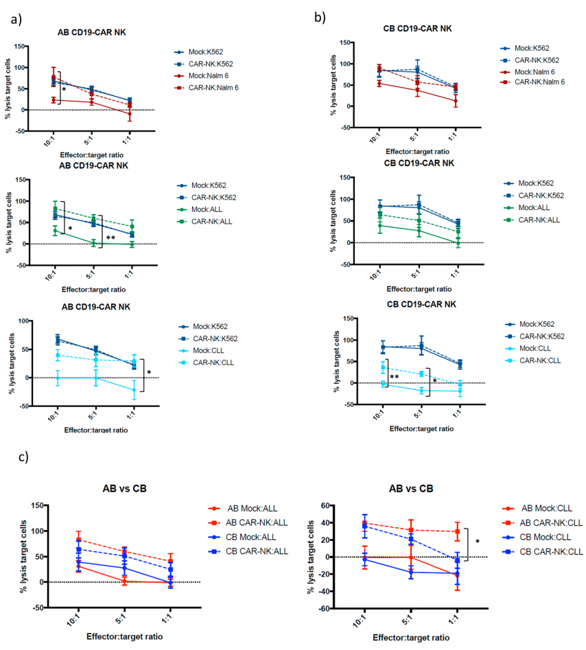 来自西班牙的研究人员在Scientific reports上发表了题为“Adult peripheral blood and umbilical cord blood NK cells are good sources for effective CAR therapy against CD19 positive leukemic cells”的研究文章。该文章主要研究了来自成人外周血(AB)和脐带血(CB)的NK细胞对不同靶细胞的作用,以确定CAR治疗的最佳来源。