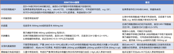 机会性感染风险因素包括既往ASCT/allo-HCT、桥接治疗和类固醇/托珠单抗用于CRS/ICANS治疗。大多数早期感染 (前30天)为细菌或呼吸道病毒感染,侵袭性真菌感染罕见;30天后以病毒感染为主。CAR-T细胞治疗后G-CSF早期应用的负面影响尚未得到明确的证实;近期一份在CAR-T细胞输注后第5天开始G-CSF治疗的报告显示,CRS或ICANS发生率未增加,表明早期应用可能是安全的且可能缩短中性粒细胞减少的持续时间;需要进一步数据以支持该观察结果,在出现发热性中性粒细胞减少的患者中,强烈建议广谱抗生素经验性治疗[1]