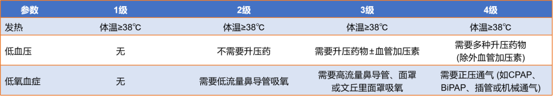 现在临床研究中用于CRS分级的方法有多种,参考美国卫生及公共卫生服务部提出的常见不良事件评价标准(common terminology criteria foradverse events,CTCAE) 4.0版的分级机制,共分为5级,不良反应逐级递增,5级即死亡。1-4分级标准如图4所示。