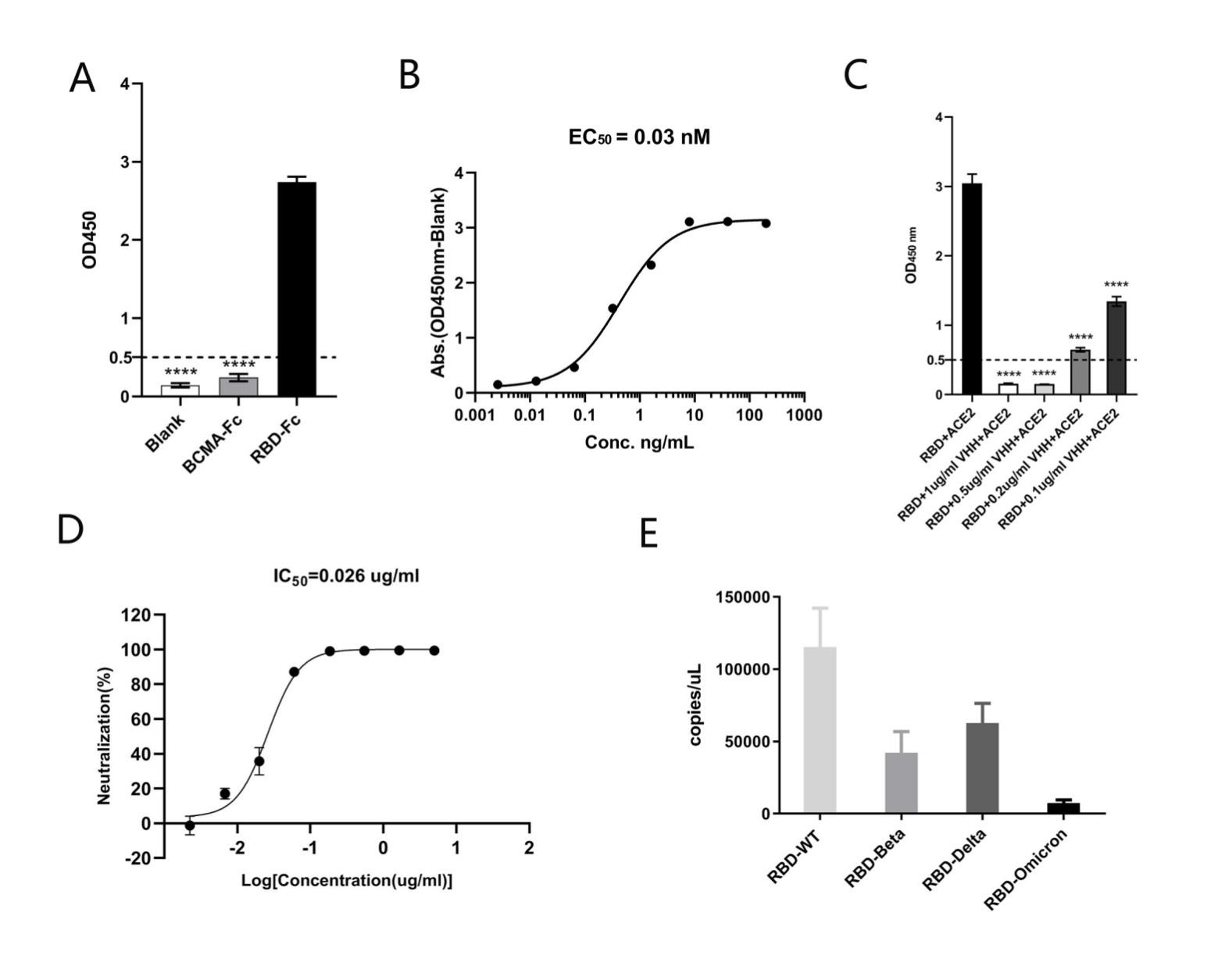 In order to uate the biological activity of purified VHH5-05 antibody, the team verified the binding specificity of the antibody and determined the antibody affinity by ELISA. The results showed that VHH5-05 can specifically bind SARS-CoV-2(WT)RBD with a high affinity (EC50=0.03 nM). The ability of purified antibody to block the binding of RBD to ACE2 recombinant protein in vitro was also verified by competitive ELISA assay. At 0.5µg/mL, VHH5-05 showed obvious binding blocking effect of RBD-ACE2, and the blocking effect was still significant when the concentration was reduced to 0.1µg/mL. The feasibility of the competitive panning method adopted in this study is further confirmed. Based on the results of this verification step, it can be preliminarily inferred that the binding sites of the screened VHH5-05 antibody and RBD-ACE2 are quite coexisting. The neutralization activity of VHH5-05 was determined by pseudovirus neutralization test. The results showed that VHH5-05 could effectively neutralize SARS-CoV-2WT pseudovirus with IC50 of 0.026μg/mL.