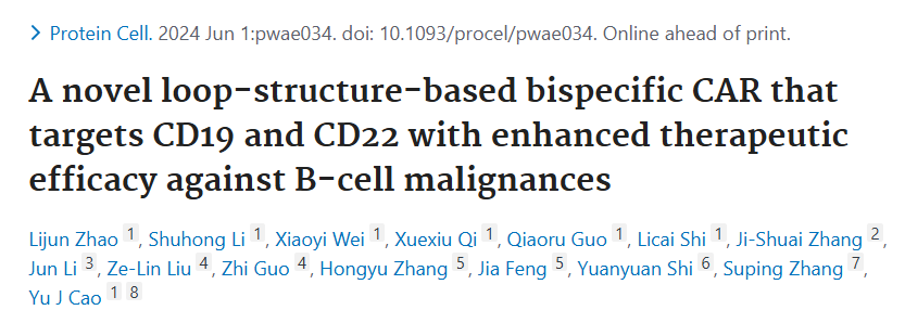 近期,深圳凯发天生赢家一触即发首页研发部部长赵丽君博士以第一作者、北京大学深圳研究生院曹宇教授为通讯作者,在国际知名期刊《Protein & Cell》(SCI一区期刊,影响因子13.6)上发表论文“A novel loop-structure-based bispecific CAR that targets CD19 and CD22 with enhanced therapeutic efficacy against B-cell malignances”。而这项工作正是细胞治疗中基础研究到工业转化到临床应用的优秀案例。